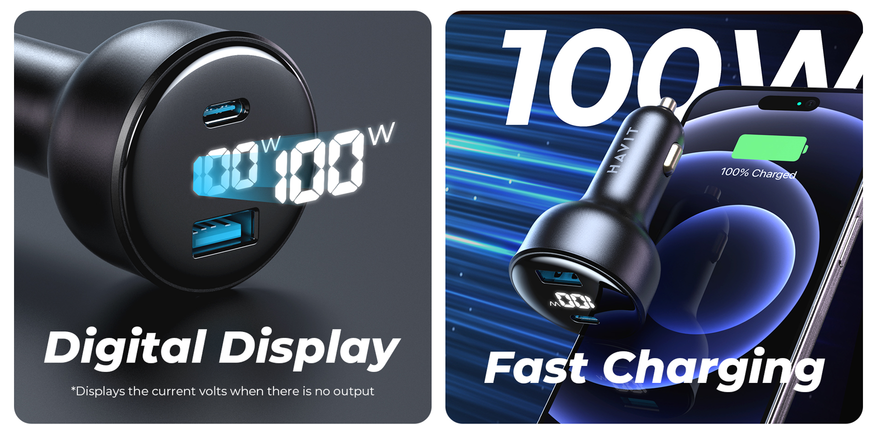 Incarcator auto cu Display Digital HAVIT CC100W, 1 USB-A, 1 USB-C, 100W, Negru