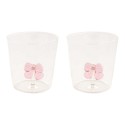 Set 2 pahare, din sticla borosilicata, decorate in interior cu un element suflat manual, din sticla colorata, marca Nuova R2S. Paharele au un design unic si delicat, cu element suflat in interior in forma de fundita. Se pot curata in masina de spalat vase. Se pot introduce in cuptorul cu microunde. La spalarea manuala, evitati sa folositi bureti sau perii pentru a nu deteriora decoratiunea din interior. Capacitate individuala: 350 ml