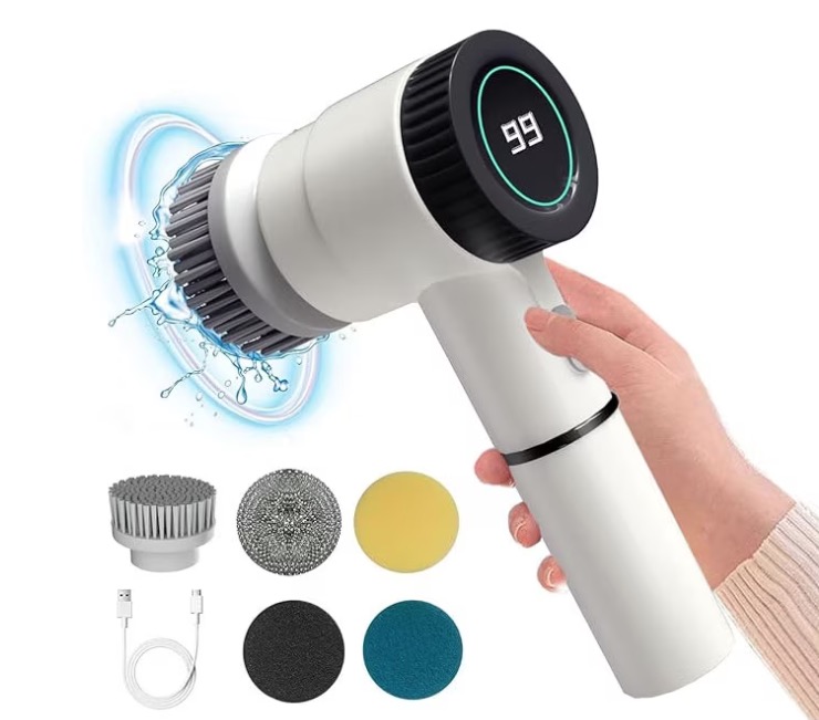 5 capete pentru curatarea diverselor suprafete Display digital cu reglaj de viteza si autonomie Functionare wireless – baterie reincarcabila USB Ideala pentru baie, bucatarie, tapiterie, incaltaminte si jante auto Rezistenta la apa si murdarie, usor de curatat Simplifica-ti curatenia cu peria electrica multifunctionala 5 in 1 – un dispozitiv puternic si versatil pentru intreaga casa si pentru masina. Cu 5 capete interschimbabile, aceasta perie curata eficient gresie, faianta, cada, robineti, aragaz, jante auto, tapiterie, mobilier, incaltaminte si multe altele. Dotata cu un display digital inteligent, poti controla nivelul de putere, viteza si nivelul bateriei. Functioneaza wireless si se incarca rapid prin USB – perfecta pentru curatenie rapida, oriunde ai nevoie. Capete incluse: Perie dura – pentru rosturi, faianta, gresie Perie moale – pentru suprafete delicate Cap burete – pentru oglinzi, geamuri, inox Cap cu lavabila rotativa – ideal pentru masina Cap extensibil – pentru colturi greu accesibile Caracteristici tehnice: 3 trepte de viteza Timp de functionare: pana la 90 de minute Incarcare rapida USB (cablu inclus) Rezistenta la apa: IPX7 Motor puternic, silentios Greutate: 290 g Utilizare recomandata: Curatarea baii si bucatariei Curatarea jantelor si interiorului auto Intretinerea aparatelor electrocasnice Curatarea rosturilor, colturilor si suprafetelor greu accesibile Curatarea incaltamintei