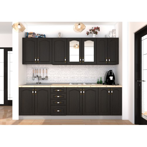 Bucataria Zebra 2.6 metri MDF wenge mustata are corpurile fabricate din PAL melaminat wenge cu grosimea de 16 mm, usile sunt fabricate din MDF infoliat wenge mustata cu grosimea de 18 mm, iar blatul are culoarea cmarmura si are grosimea de 28 mm. Usile sunt frezate cu model mustata : au manere metalice cu ornamente din ceramica cu model floral si balamale cu piston (inchidere soft close). Blatul este atermic fiind rezistent la temperaturi ridicate. Blatul are lungimea de 2.6 metri si vine nedecupat pentru chiuveta. Decupajul pentru chiuveta il veti face dupa ce stabiliti ordinea finala a corpurilor in bucataria dvs. si dupa modelul de chiuveta ales. Lungimea totala a bucatariei este de 2600 mm, inaltimea corpurilor de jos este de 820 mm fara blat si 858 mm cu tot cu blat, iar inaltimea corpurilor de sus este de 720 mm. Adancimea blatului este de 600 mm, iar adancimea corpurilor inferioare este de 481 mm ca sa ramana loc prin spatele acestora pentru diverse tevi, racorduri, plinte etc. care sunt in orice bucatarie. Adancimea corpurilor de sus este de 310 mm. Picioarele reglabile din plastic au inaltimea de 100 mm. Cele 8 corpuri care formeaza bucataria (4 inferioare si 4 superioare) se pot aseza in orice ordine doriti fiind independente si abia apoi le puteti prinde intre ele folosind suruburile de cuplare din accesorii. Corpurile care formeaza bucataria sunt: Inferioare: - Masca de chiuveta cu 2 usi de 80 cm latime - Corp cu 4 sertare de 40 cm latime - Corp cu 2 usi si 2 spatii de depozitare in interior de 80 cm latime - Corp cu 2 usi si 2 spatii de depozitare in interior de 60 cm latime Superioare: - Corp cu 2 usi cu 3 spatii de depozitare in interior de 80 cm latime - Corp cu 1 usa si 3 spatii de depzoitare in interior de 40 cm latime - Vitrina cu 2 usi si 3 spatii de depozitare in interior de 80 cm latime - Corp cu 2 usi si 3 spatii de depozitare in interior cu 60 cm latime Corpurile superioare se suspenda pe o sina metalica si au reglaj din interior. Sina metalica este inclusa in pretul bucatariei. Bucataria contine tot ce aveti nevoie pentru a o monta, mai putin diblurile cu care se prinde sina de suspendare in perete si care trebuie sa fie adaptate pentru tipul de perete din camera dvs.: beton, caramida, rigips etc. Puteti adauga si alte accesorii practice la aceasta bucatarie: - Profil antistrop pentru blat argintiu ca sa nu se scurga lichide intre blat si perete (are banda din silicon pe ambele laturi). Aveti nevoie de un profil de 4 metri ( comanda aici ) si un set de accesorii pentru profil care contine 2 dopuri si 1 colt interior in cazul in care doriti sa puneti profil si pe adancimea blatului ( comanda aici ). - Plinta argintie care mascheaza picioarele si nu permite intrarea prafului sub corpuri (are banda din silicon pe latura care vine pe podea). Aveti nevoie de o plinta de 4 metri ( comanda aici ), de 4 cleme pentru prinderea plintei de picioare ( comanda aici ) si 2 terminatii de plinta pentru capete ca sa mascheze taietura plintei dar si pentru cot in cazul in care doriti sa puneti plinta si pe lateralele bucatariei ( comanda aici ). Nota: Schita de montaj nu se afla in interiorul coletului intre piesele de mobila. Schita de montaj o sa fie atasata pe spatele facturii.