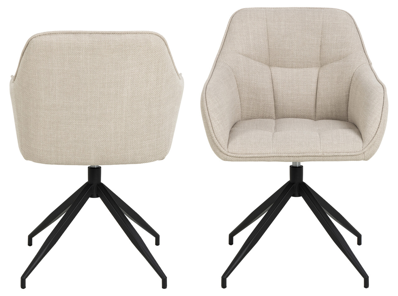Adu design si confort in zona ta de dining. Tapiteria bej este decorata cu un model patrat de cusaturi care confera rafinament acestui scaun elegant. Observa textura materialului si efectul two-tone care adauga profunzime vizuala. Finalizat cu o baza metalica neagra cu functie de pivotare, ofera rotire usoara si stabilitate.Compozitie materialMaterial tapiterie: material textil structurat, 100% poliesterRezistenta la abraziune (test Martindale): > 50.000 cicluriTip tapiterie: tesatura Basel, bej, cod 24.Material picioare / baza: otel, finisaj cu vopsea pulbere cu textura naturInformatii si dimensiuni specificeInaltime sezut: 46 cmLungime sezut: 41 cmAdancime sezut: 40.5 cmInaltime brate: 19 cmInaltime brate de la podea: 67.5 cmLatime brate: 4 cmAdancime brate: 35 cmInaltime spatar: 36 cmInaltime picioare: 39.5 cmCuloare baza / picioare: negru matBaza rotativa (functie swivel)Produsul necesita asamblare partiala.Greutata maxima suportata: 110 kg