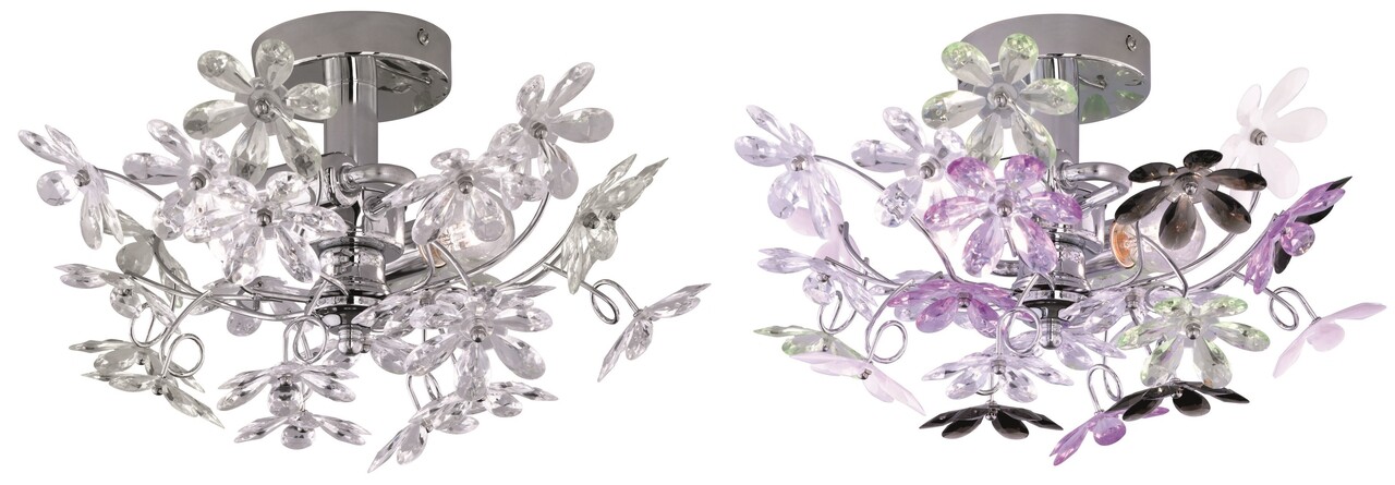 O atragere artistica a privirilor! Aceasta plafoniera FLOWER de inalta calitate, cu design floral, aduce stralucire spatiului dumneavoastra de locuit. Datorita florilor acrilice, plafoniera ofera o iluminare eficienta si nu numai ca creeaza un model luminos deosebit, ci si o opera de arta stralucitoare. Plafoniera este deosebit de impresionanta ca element decorativ in zona de living si de luat masa. Plafoniera este alcatuita dintr-un baldachin cromat si flori acrilice transparente si colorate si se integreaza usor in diverse stiluri de interior. Pentru un iluminat economic, se recomanda utilizarea unui bec LED. Acestea reprezinta o alternativa optima la lampile cu halogen conventionale si reprezinta o calitate ridicata a luminii si economii de energie de pana la 80%. In plus, lampile LED va ajuta sa beneficiati de o durata lunga de viata, o generare redusa de caldura si, in acelasi timp, protejati mediul inconjurator.RL reprezinta o serie de corpuri de iluminat noi si la moda. Pe langa corpurile de iluminat la moda, ventilatoarele sau lampile solare sunt, de asemenea, o parte integranta a acestui brand.SpecificatiiBecurile nu sunt incluse.Grad de protectie: IP20Tensiune si frecventa: 230V ~ 50HzClasa de eficienta ETip soclu: 2x E14Putere: 40W