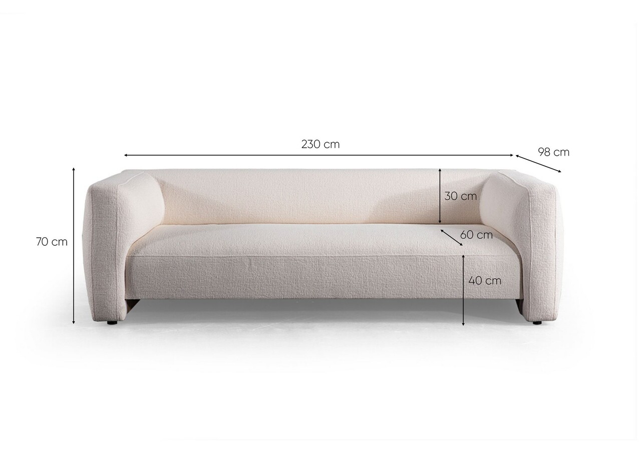 Canapea 3 locuriTesatura: Poliester28 straturi de spumă DNSLungime: 230 cm Latime: 98 cm Inaltime: 70 cmSpuma: 28 DNS FOAMTesatura care se curata uscatPicioare: Picioare din lemn vopsit, nuc, 12 cm înălțime