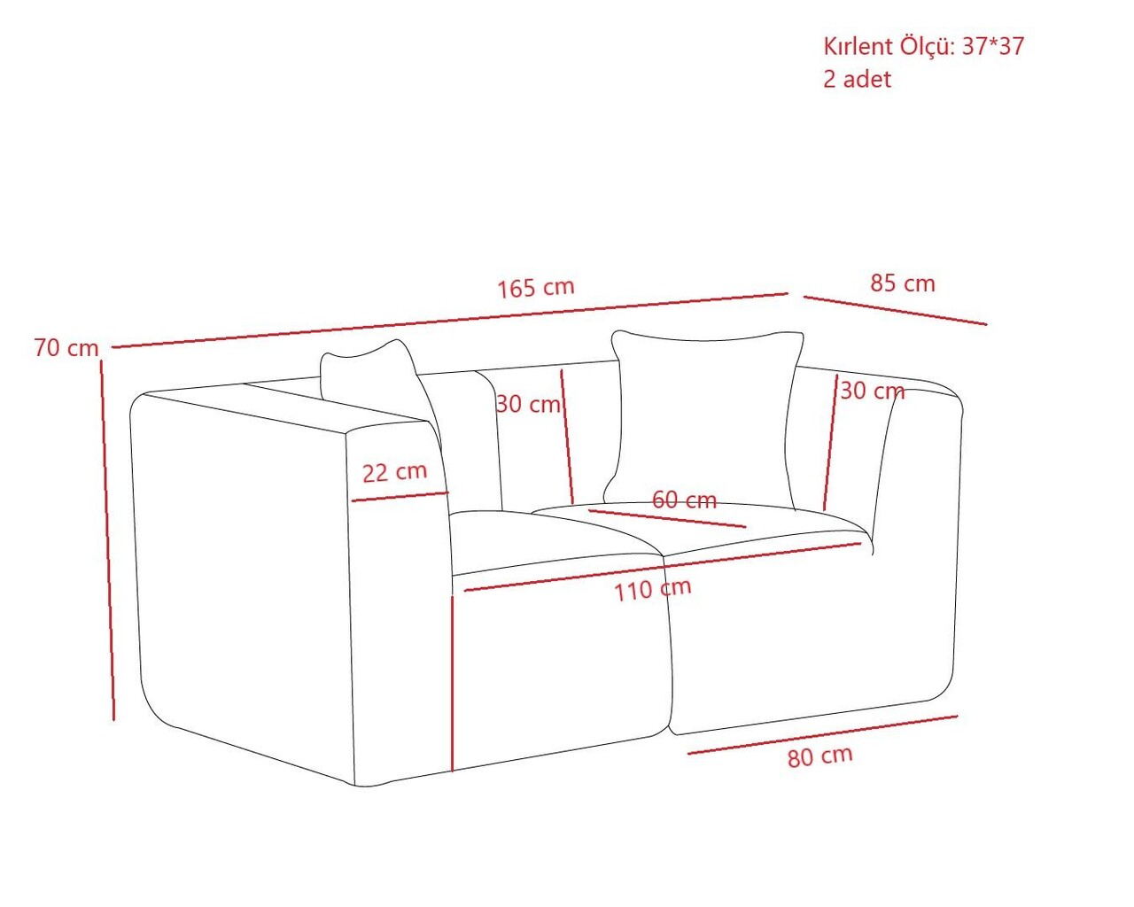 Canapea 2 locuriCorpul canapelei: 100% spumăFără structură interioară dură30 DNS Soft Foam for Sitting and BackPartical Foam Filled CushionsLatime: 165 cm Inaltime: 70 cm Adancime: 85 cmLatime sezut: 110 cmAdancime sezut: 60 cmInaltime sezut: 40 cmDimensiunea pernei: 37 x 27 cmPrietenos cu mediulNu necesită asamblare