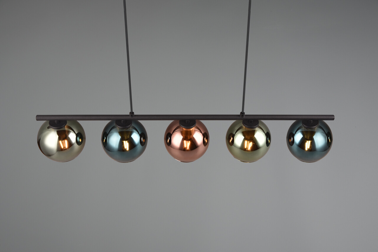 Eleganta lustra SHELDON impresioneaza prin formele sale organice si sticla colorata cu efect de oglinda. Cele cinci abajururi stralucitoare din sticla creeaza o ambianta magica cu un joc de lumini incitant si devin un element decorativ cu efect wow. Imbunatatiti-va elegant si cu maiestrie zona de luat masa sau de living cu SHELDON! Combinatia de metal negru mat si abajururi din sticla rosiatica, albastruie si verzuie duce factorul de stil al corpului de iluminat la un nivel complet nou. Pentru o iluminare moderna si fiabila, se recomanda utilizarea unui bec LED. Ofera o calitate inalta a luminii, este versatila si convinge prin iluminarea uniforma. Durata lunga de viata si generarea redusa de caldura o fac alegerea ideala pentru o gama larga de aplicatii.RL reprezinta o serie de corpuri de iluminat noi si la moda. Pe langa corpurile de iluminat la moda, ventilatoarele sau lampile solare sunt, de asemenea, o parte integranta a acestui brand.SpecificatiiBecurile nu sunt incluse.Grad de protectie: IP20Tensiune si frecventa: 230V ~ 50HzClasa de eficienta FTip soclu: 5x E14Putere: 10W