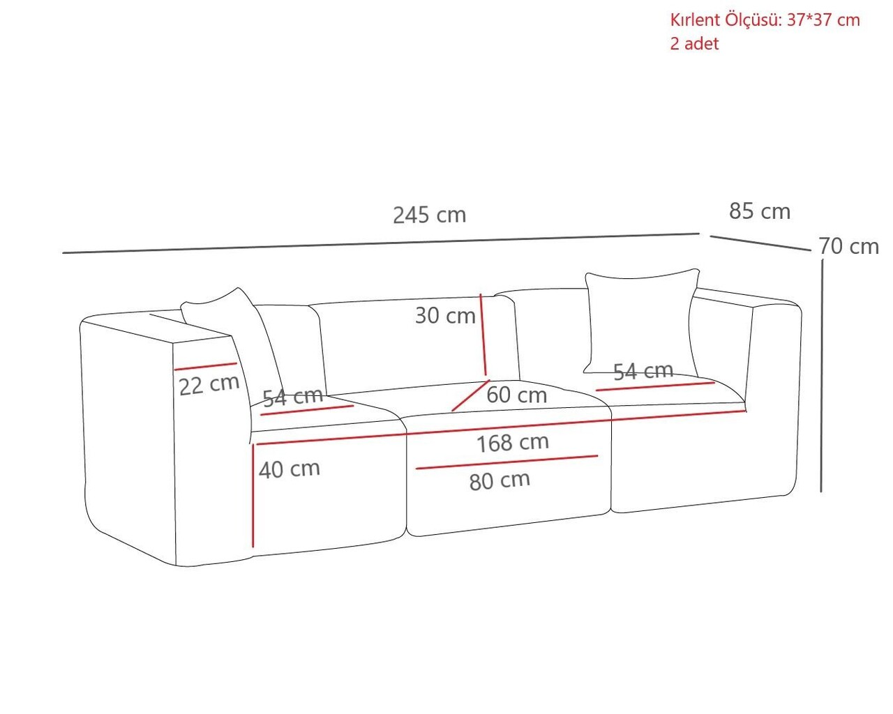 Canapea 3 locuriCorpul canapelei: 100% spumăFără structură interioară dură30 DNS Soft Foam for Sitting and BackPartical Foam Filled CushionsLatime: 245 cm Inaltime: 70 cm Adancime: 85 cmLatime sezut: 168 cmAdancime sezut: 60 cmInaltime sezut: 40 cmGrosimea cotierei: 22 cmDimensiunea pernei: 37 x 37 cmPrietenos cu mediulNu necesită asamblare